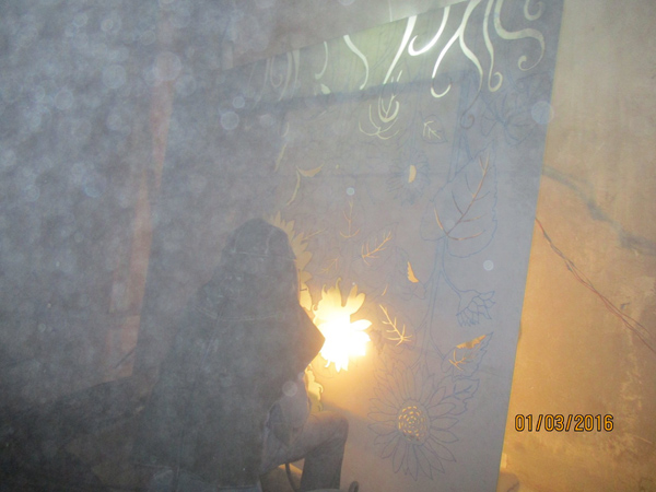 Sau khi khảo sát, tư vấn, thiết kế và chọn được mẫu tranh để sản xuất, công đoạn đầu tiên là người Họa sỹ phải vẽ, phóng bức tranh đó lên tấm kính đã được dán 2 lớp decan trắng theo tỷ lệ 1:1